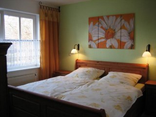 Das Schlafzimmer hat ein Doppelbett und einen 4türigen Kleiderschrank. Das